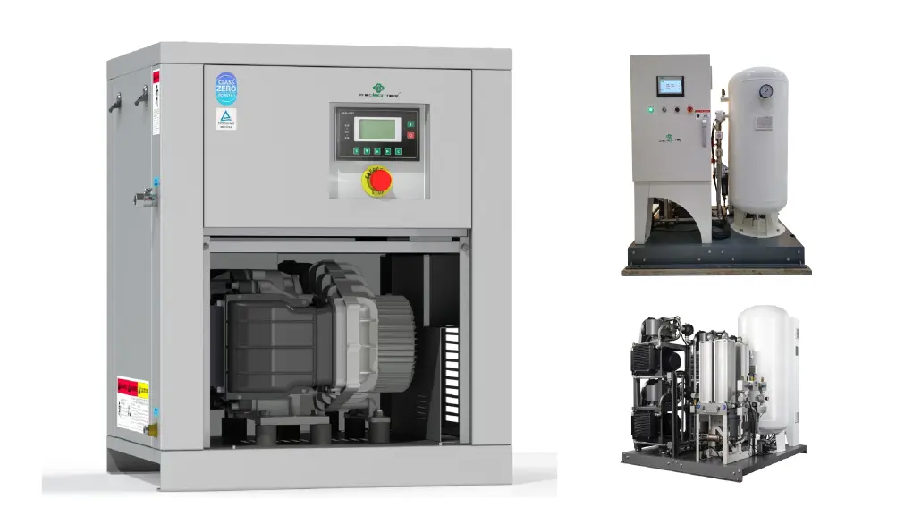 Функција: Употревање вијака ротационе компресије гаса, глатког рада, ниске буке, погодне за велике протокове, средње и нискотељене апликације, обично се користи у болничком централизованом систему снабдевања гасом.